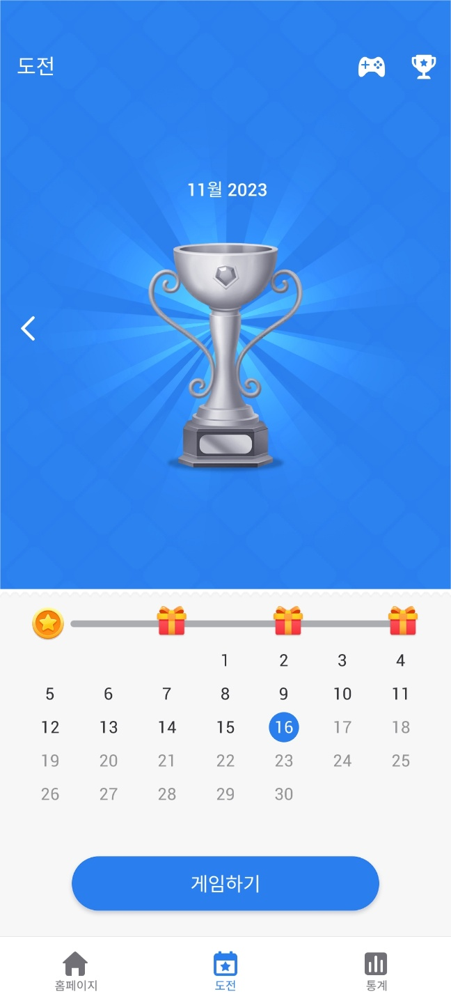오늘의 도전을 누르면 매일 일일 미션이 있습니다. 해당 미션을 클리어하면 힌트 등의 혜택을 얻을 수 있습니다.