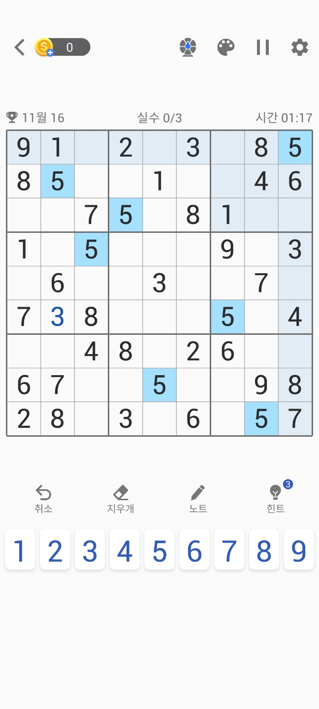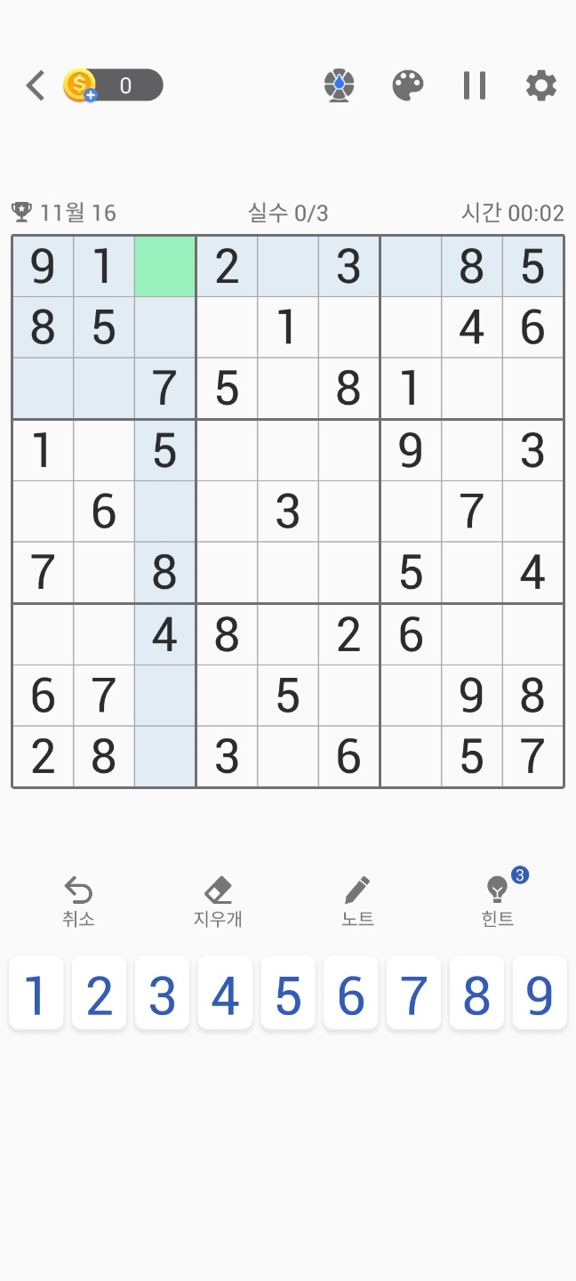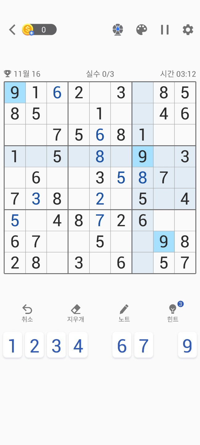 종이로 하던 스도쿠 게임보다 좋은 점은 숫자를 클릭하면 해당 숫자가 우측 화면처럼 모두 선택되어 보기 쉽게 표기되기 때문에 종이로 풀이하던 스도쿠보다 훨씬 쉽게 플레이를 할 수 있는 장점이 있습니다.