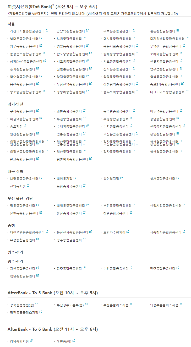 아래의 리스트에서 지점을 찾은 후 위의 지점검색에서 해당 지점의 전화번호로 내가 처리해야하는 업무가 16시 이후에도 가능한지 꼭 확인 후 방문하시기 바랍니다.