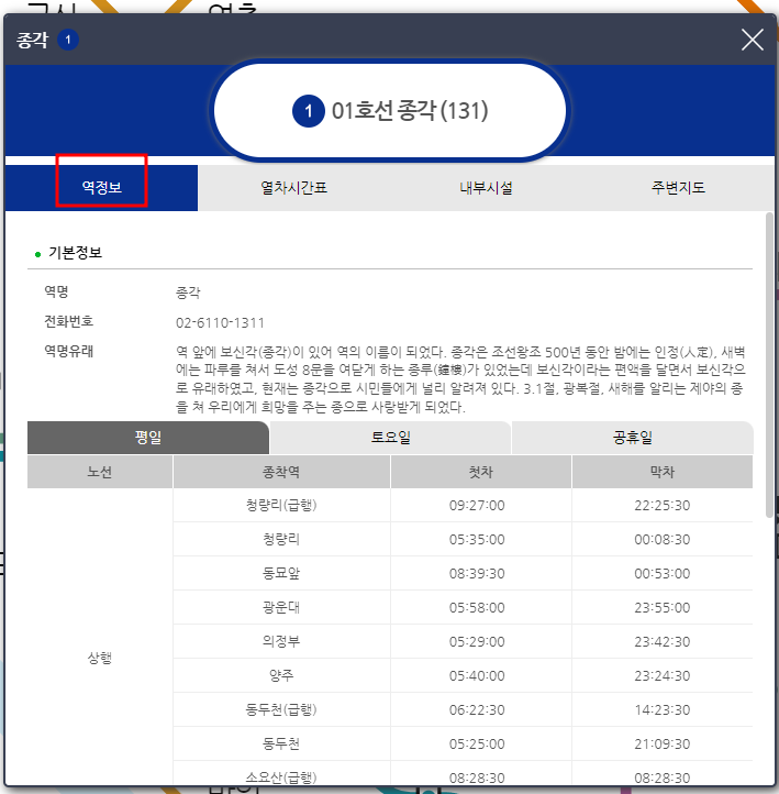 상단 메뉴의 역정보를 클릭하면 첫차와 막차의 정보를 보기쉽게 정리된 내용으로 볼 수 있습니다.