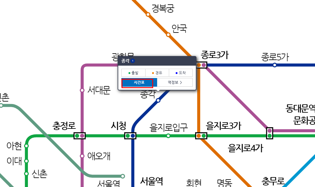 저는 종각으로 검색하여 종각역의 운행시간표 확인을 진행했습니다.