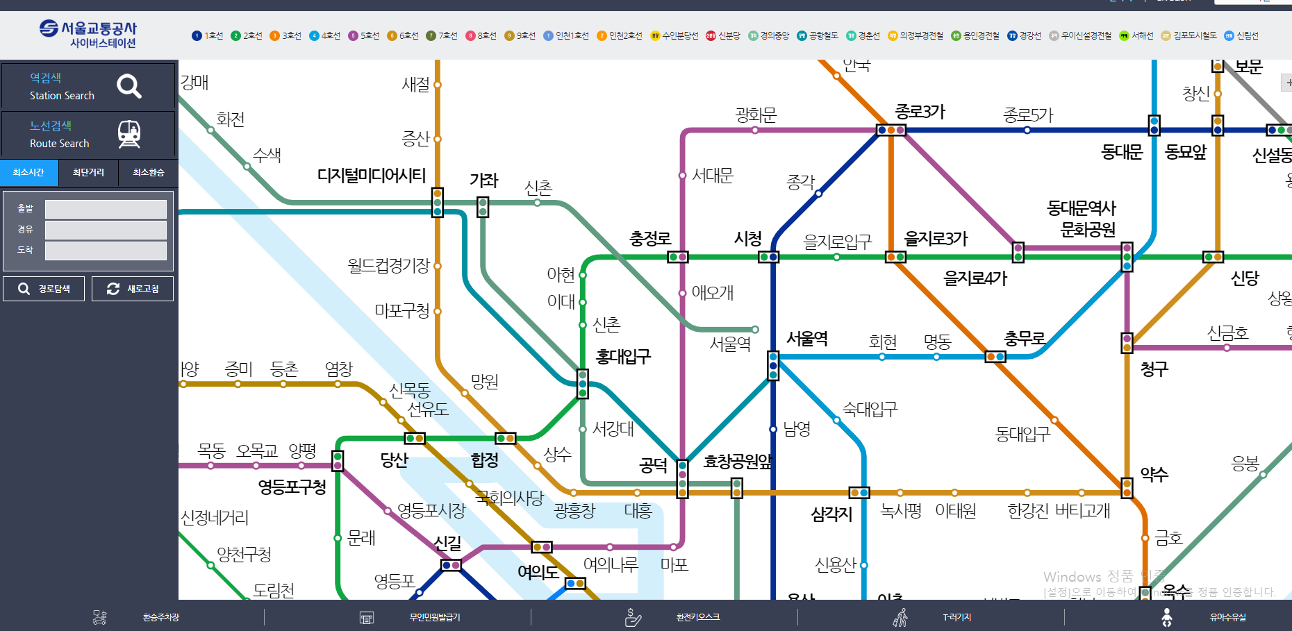 아래의 바로가기로 서울메트로 스테이션 홈페이지를 빠르게 접속할 수 있습니다. 접속하면 아래의 그림과 같은 지하철 노선도를 확인할 수 있습니다.