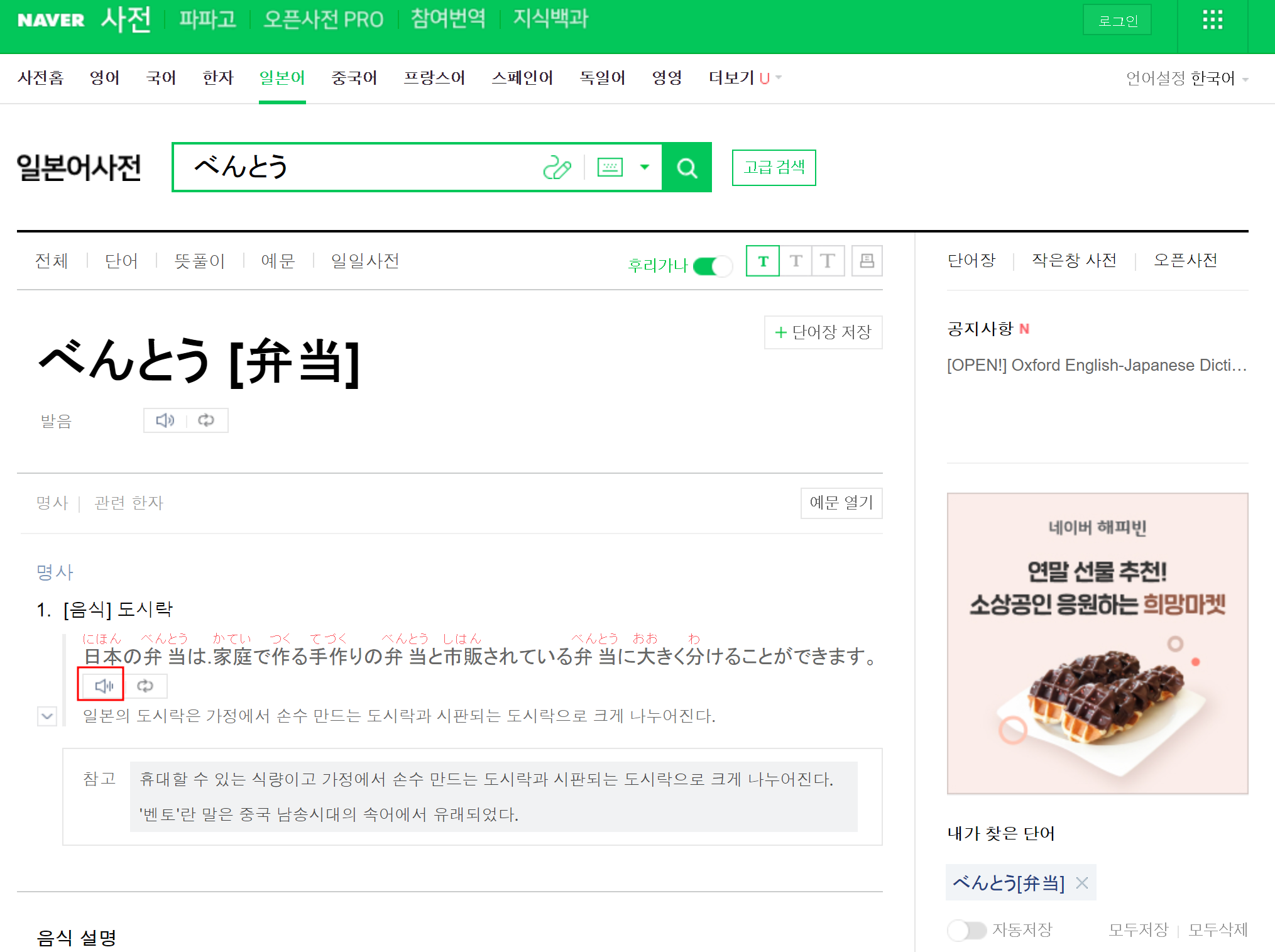 좌측 하단의 스피커 버튼을 클릭하면 발음 소리도 들을 수 있습니다.