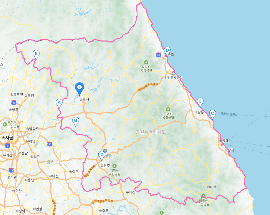 빨간라인이 강원도로 한바퀴 돌려서 잘라서 업로드했습니다.