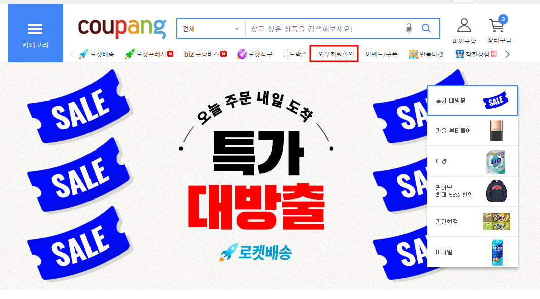 아래의 화면과 같이 메뉴바 중간의 와우회원할인을 클릭합니다. 혹시 와우회원할인 버튼이 보이지 않을 경우는 마이쿠팡에서 와우할인을 클릭합니다.
