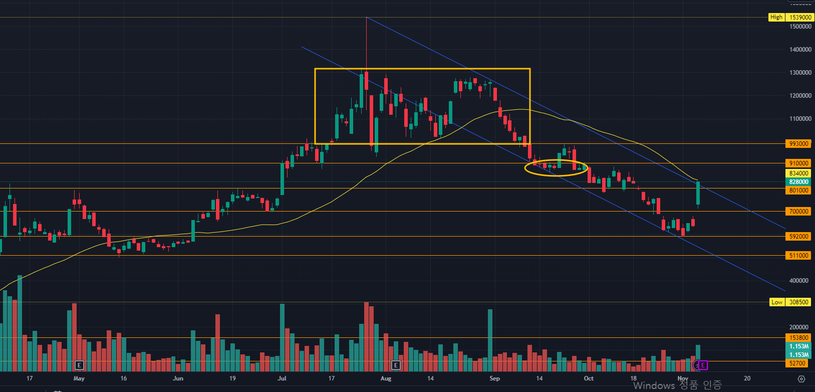 추가 상승이 나오면 90만원까지는 무난히 가지 않을까 생각하고 있습니다.